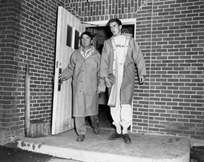 Arlington Heights' track coach, Homer Pegram, left, heads for the practice field with his discus thrower, Gordon Gooch, after the city track meet prelims were postponed because of cool weather. Published in Fort Worth Star-Telegram morning edition April 10, 1952.