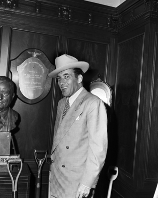 Ed Sullivan, seen in Shady oak hat presented to him by Amon Carter. Ed Sullivan, the television king and Broadway columnist was in Fort Worth working with worthy charities, plugging the automobiles of his TV client and spreading his Irish charm. Published in Fort Worth Star-Telegram evening edition April 9, 1952.
