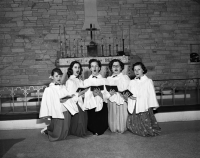 Typifying the Easter spirit these five members of the 30-voice St. Joan's Girl's Choir, directed by Cecil Bailey at Trinity Episcopal Church, will sing for the children's service at 4 p.m. They are, left to right, Gay Anderson, Elizabeth Barnes, Theta Champion, Tommye Westmoreland, and Ann McClure. Published in Fort Worth Star-Telegram evening edition April 9, 1952.