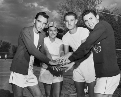 Seeking city school net championships are Amon Carter Riverside's Jerry Miller, Ginger Wofford (girls' singles), Bill Hunnicutt and Kaye Cox (boys doubles), left to right. Published in Fort Worth Star-Telegram evening edition April 11, 1952.