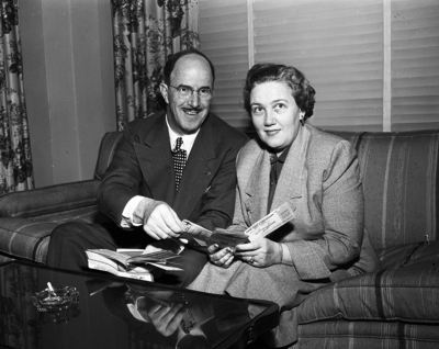 Mr. and Mrs. Roly P. Nall seen with travel tickets in hand. Published in Fort Worth Star-Telegram evening edition April 10, 1952.
