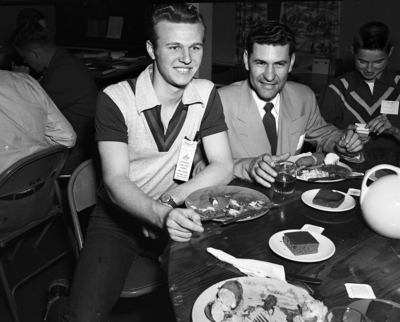Bob Davis, left, national vice chairman of Allied Youth, Inc., and Ed B. Branom, secretary of the Southwestern Conference, reviewed the schedule for the three-day meeting of Allied Youth at Camp Carter. Published in Fort Worth Star-Telegram evening edition April 10, 1952.