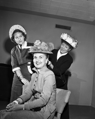 Mrs. John M. Scott, left, was chairman of an Easter Bonnet luncheon given by Monticello Garden Club at River Crest Country Club. Mrs. Walton Wilfong, center, won first prize with her fresh geranium-trimmed hat. Mrs. Harry B. Friedman, right, whose hat is deck with fresh white roses, was the judge. Published in Fort Worth Star-Telegram evening edition April 10, 1952.