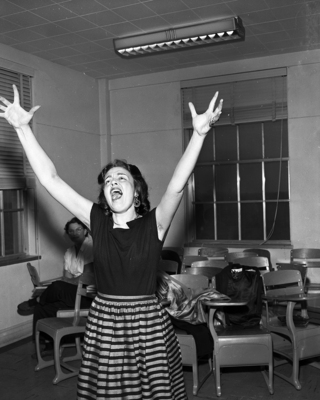 Nell Rankin, of the Metropolitan Opera, is one of the stars of the Fort Worth Opera's "Il Trovatore", is shown rehearsing an aria from the Verdi masterpiece which will be performed at Will Rogers Memorial Auditorium, April 14 and 16. Published in Fort Worth Star-Telegram evening edition April 10, 1952.