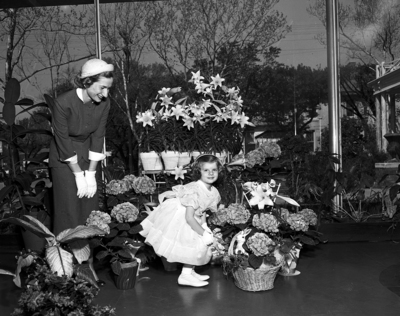 Surprised to find a bunny in a basket of hydrangeas is Cheryn Boesch, cousin of Miss Dorothy Rhea, left. Published in Fort Worth Star-Telegram evening edition April 13, 1952.