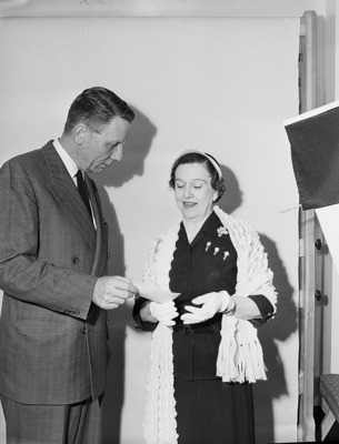 Mrs. Paul T. Bryenton of the Fort Worth District Dental Auxiliary is shown presenting a $200 check from the auxiliary to Brandon Stone of the Fort Worth Heart Association. Mrs. Bryenton is chairman of the auxiliary's heart committee. Published in Fort Worth Star-Telegram evening edition April 18, 1952.