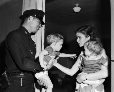Two-year-old Mike Dennis had a brief stroll when he snuck off from his home at 816 E. Elmwood. Mike was returned home by Patrolman Counts, delivering the youngster to his mother. Mrs. J. L. Dennis is holding Mike's little sister, Isabell. Published in Fort Worth Star-Telegram evening edition April 11, 1952.