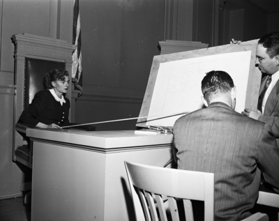 Mrs. Faye Barber points out on a map of the Barber home at 1933 Queen the positions of detectives who, she said, entered by pushing by her at the door. She testified Friday night. Defense Attorney Frank Massey holds the map as Court Reporter Kenneth Toal records testimony. Published in Fort Worth Star-Telegram evening edition April 11, 1952.