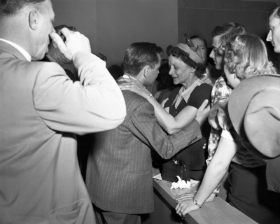 Mrs. R. H. Barber Sr. receives solace from her convicted son after hearing the jury's verdict that Robert Barber Jr. was guilty of slaying a city detective and should serve 50 years in prison. Published in Fort Worth Star-Telegram evening edition April 13, 1952.