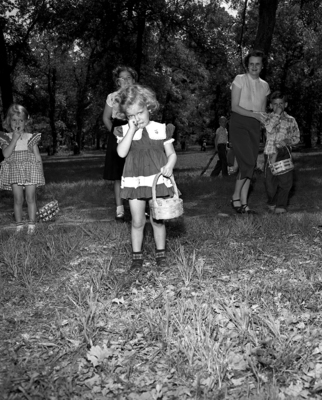 While other children proudly displayed their Easter eggs, Carolyn Brinkley had tears to show. Her basket was empty at the end of the Junior Chamber of Commerce's Easter egg hunt in Trinity Park. Carolyn is the daughter of Mr. and Mrs. Floyd E. Brinkley of 728 Essex. Published in Fort Worth Star-Telegram evening edition April 13, 1952.