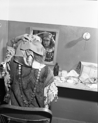 Nell Rankin of the Metropolitan Opera, Azucena in "IL Trovatore", is shown making up for the role. The Verdi masterpiece will be performed again at Will Rogers Memorial Auditorium. Miss Rankin is wearing an ancient dress with a head scarf sitting facing to a mirror. Published in Fort Worth Star-Telegram evening edition April 16, 1952.