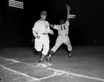 Shortstop Bill Hunter legs it across first base in first inning with Cats' initial hit of season at La Grave Field. Dallas' Allen Maul reaches for Shortstop Clyde Perry's throw. Published in Fort Worth Star-Telegram evening edition, April 15, 1952.