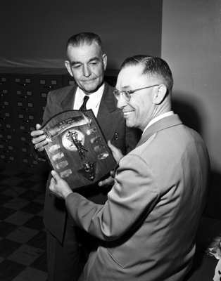 George Fisher, left, and Robert L. Hoyt inspect the W. B. Todd Annual Award which will be presented to the YMCA community branch getting the greatest percentage increase during the membership roundup. Fisher and Hoyt are leaders in the campaign. Published in Fort Worth Star-Telegram evening edition April 14, 1952.