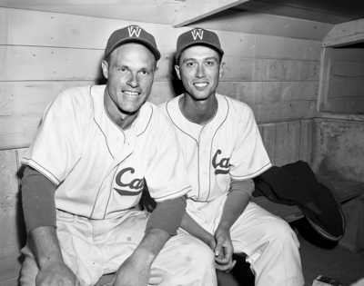 Gale Wade, left and Earnest Nichols, right of Fort Worth Cats Baseball are shown in the photograph.