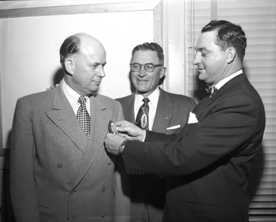 North Side Lions Club president, C. D. (Nick) Nichols, right, pins an official badge on Orval Shore of Mineral Wells, Lions district governor, at the club's dedication dinner. J. Harrold Evans, deputy district governor, looks on. Shore was special guest when the Lions dedicated their new building. Published in Fort Worth Star-Telegram morning edition, April 17, 1952.