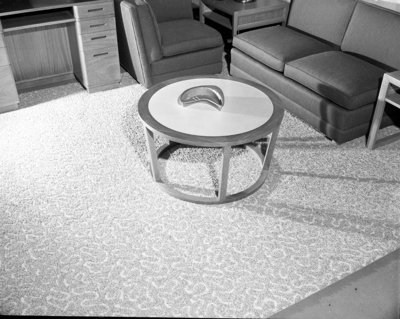 An all rayon face gives beauty of color and texture to the lock weave carpet which Bigelow calls Adagio. Carpet manufacturers have just started using 100 percent rayon in rugs which give equal service with woolen broadlooms. Adagio is made in beige, gray, and a combination of gray and green. A table and a couch is on top of the carpet. Published in Fort Worth Star-Telegram morning edition April 20, 1952.
