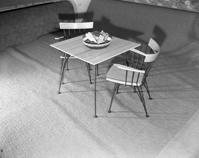 Bigelow's Cordalon, a new wool and carpet rayon rug, fits right into this modern setting but could as well be the background for traditional or provincial. It's available in shades of green, gray, brown, beige, and it's high and low ripple texture eliminates tracking. A dining table and chair is on the lined carpet. Published in Fort Worth Star-Telegram morning edition April 20, 1952.