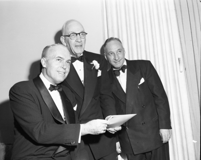William T. Gossett, left, Ford Motor Company vice president and general counsel, was featured speaker at a dinner honoring Dr. M. E. Sadler, Texas Christian University (TCU) president, for work in the National Conference of Christians and Jews. J. Lee Johnson Jr., center, and Web Maddox, participated in the program. Published in Fort Worth Star-Telegram evening edition April 18, 1952.