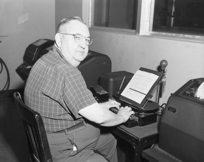 At right, Tom Davis grimaces as he "sends" via teletype.