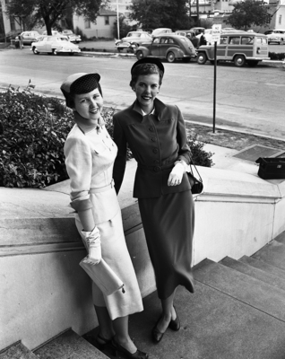 Two of the first prize winning entries in the Star-Telegram's Home Sewing Contest are modeled here. Miss Joyce Chambers of Everman, left, models the dress which won for her the tailored dresses prize and Miss Joan Jolley of 4500 McCart wears the suit she made to win in the senior standard pattern's suit or coat division.
