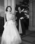 Two of the first prize winning entries in the Star-Telegram's Home Sewing Contest are modeled here. Miss Edna Marie Tims of TWC wears her prize-winning formal and Miss Loucille Hankins of Corsicana models the afternoon dress which won for Mrs. O. Williamson of Grandview.