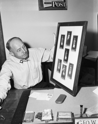 George W. Saam displays a picture of a 1906 Youth Men Christian Association (YMCA) basketball team which he captained. Saam rejoined the YMCA for his 50th consecutive membership. He has been active in the organization since 1902 and at one time served as athletic director of the Fort Worth association. Published in Fort Worth Star-Telegram evening edition April 18, 1952.