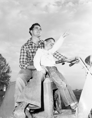 Among the thousands of spectators on White Settlement Road who watched the YB-60 take off on its initial flight was Airman First Class Fred S. Fleming of 209 Donald Street, pointing out the big bomber to his 6-year-old son, Donnie. Fleming is stationed at Carswell Air Force Base. Published in Fort Worth Star-Telegram morning edition April 19, 1952.