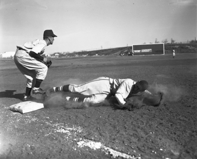 Frog First Baseman John Jones slides safely into the Sooners' third base protected by Ray Morgosh in ninth frame of the Texas Christian University (TCU) vs Oklahoma game at TCU. Jones stranded on the bag, however. TCU lost, 3-1.