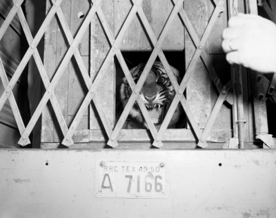 Image of Forest Park Zoo's new tigress as she explores her new home. The animal, a year-old Sumatran tigress, will be a mate for Rajah. She arrived by plane from New York.