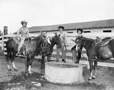 Left to right, Sallie Tucker, Andrea Pickens, and Sue Crotty. The women are shown with three horses, at a watering trough.