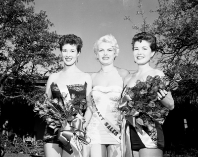 Winners in the Fort Worth-Dallas Press Photographers Association beauty contest are left to right, Jean Jackson, Bettye Flanagan, and June Jackson. The Jackson twins, from Garland, will be Dallas' candidate and Miss Flannagan will be Fort Worth's entrant in the national contest. Published in Fort Worth Star-Telegram morning edition April 21, 1952.
