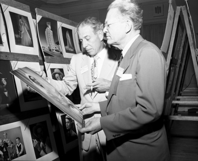 Lee Webb, left, of Houma, Louisiana, president of the Southwestern Photographers' Association, Incorporation, discusses a fine point with C. A. Taylor of Fort Worth, a director, as the association opened its silver anniversary convention at Hotel Texas. Published in Fort Worth Star-Telegram morning edition April 20, 1952.