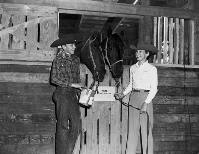 Image shows two children Jerrell Gorczyca, left, and Sarah Brewster, right. They're pictured smiling while wearing cowboy hats and western clothes standing by a horse stable with two horses.