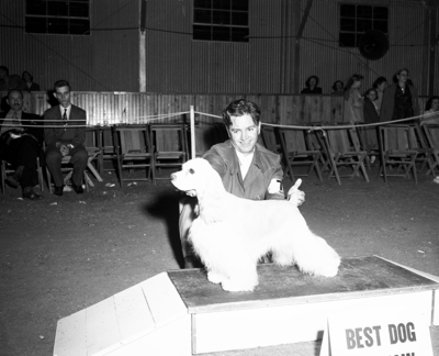 The buff cocker spaniel, Champion Spoondrift Silver Sequel, owned by Dr. Winn O. Francisco, Port Arthur, was selected best in show dog by Judge J. J. Duncan at the Fort Worth Kennel Club's show. The handler, William R. Ake, 2740 Timberline Drive, also won the Fort Worth cocker show last November with Sequel. Published in Fort Worth Star-Telegram evening edition April 22, 1952.