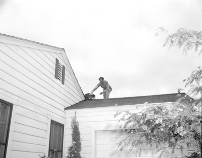 R. C. Kirkpatrick, an animal trainer, is shown on the roof at the home of Mrs. Forest Lee, 3700 College, as he cornered his fugitive monkey, "Chiggs". The monkey escaped from a cage and led Kirkpatrick and police a merry chase over trees and roof tops before he was recaptured. Published in Fort Worth Star-Telegram evening edition April 21, 1952.