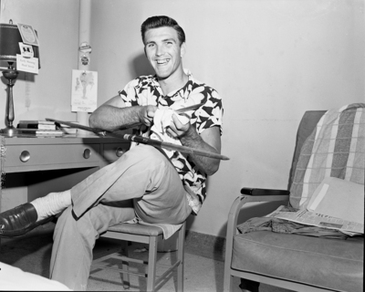 The photograph shows Wesley Richey of Frogs'. Mr. Richey is sitting on a chair and is cleaning a javelin.