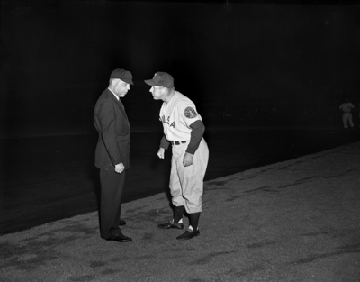 Tulsa Manager Joe Schultz takes issues with Umpire Cran in first inning of the game night when the latter ruled Cats' Wayne Belardi safe at second after Jim Peterson threw to Jim Kirby. Published in Fort Worth Star-Telegram morning edition, April 23, 1952.