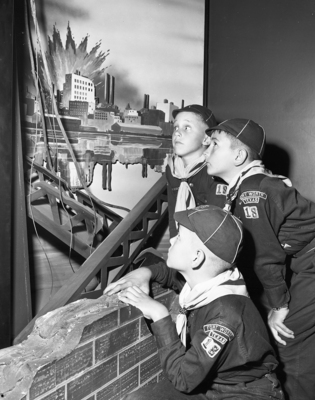 Bombs make no distinction between old and young, and perhaps that is what these Cub Scouts were thinking at the civil defense exhibit on the Will Rogers Memorial grounds. Left to right are Kendrick Adams, 3833 Marks; Johnnie McCrea, 7308 Brazos, and Gary Lockert, 4117 Southwest Boulevard. Published in Fort Worth Star-Telegram morning edition April 23, 1952.