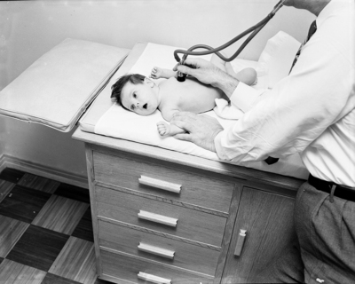 Freddie Kay Thorson, 5 weeks-old, gets a stethoscope hearing in a doctor's office and finds it doesn't hurt at all. He is the son of Mr. and Mrs. H. A. Thorson of 929 Red Oak Lane. Published in Fort Worth Star-Telegram evening edition, April 28, 1952.