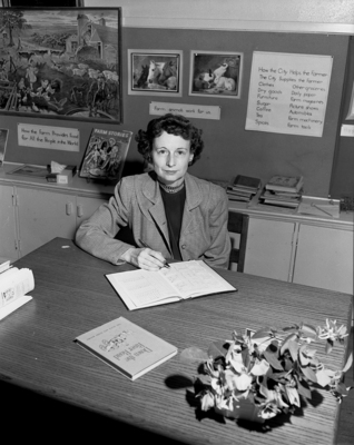 Mrs. Irma Dee Harwell, a voter who is a school teacher is seated at her desk.