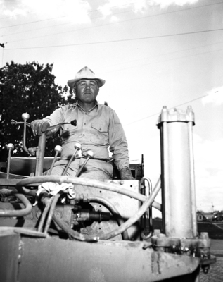Image shows E. L. Waller on a street grader, a maintainer who is a voter.