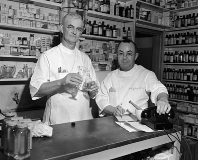 Image shows W. B. Aubrey, and R. A. Sutherland, who work as pharmacist at Ridgelea Drugstore who are also voters.
