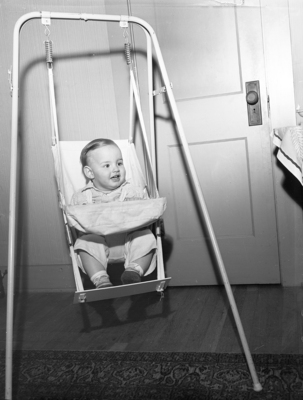 Bobby Holcomb, 11 months, wants a push in his swing. He is the son of Mr. and Mrs. Robert G. Holcomb, 3045 South Adams. Published in Fort Worth Star-Telegram evening edition April 28, 1952.