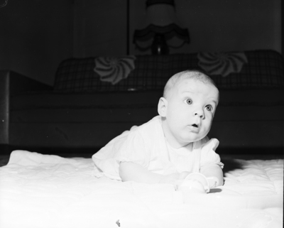 The photograph of a new born baby lying on the floor in front of a couch. Published in Fort Worth Star-Telegram evening edition April 28, 1952.