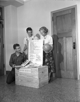 Members of Amon Carter Riverside High School's Junior Red Cross packed their seventh large box of supplies for shipment to European schools. Surveying their handiwork are, left to right, Bill Medley, 809 Higgins Lane; Jerry Weatherby, Rr. 5, Bo 189, and Peggy Abel, 2900 Watauga.