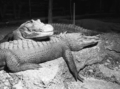 Forest Park Zoo had these two cases of spring fever and accompanying smiles of contentment. Creatures in focus, two hefty' alligators of usually mean disposition, were so lazy basking in the warm sunshine they mustered no more than a toothsome grin when the photographer approached on dangerous ground.