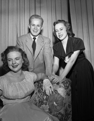 Two members of the opera chorus, Dorothy "Dotty" Patterson, left, and Dick Slone, center, both Texas Christian University (TCU) Students, were among the guests at the reception held after the performance of "Faust." The Opera Guild of Fort Worth gave the reception at River Crest Country Club. An unidentified woman is also present.
