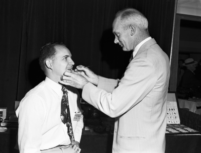 Dr. Thomas L. Phillips of Fort Worth, a dentist, seated, is getting a checkup from Dr. Thomas S. Smith of El Paso. They are at the Texas State Dental Society convention at the Hilton Hotel.