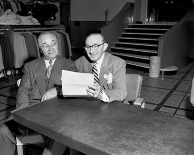 Barney Ruben, left, president and chairman of the board, and J. W. Connors, vice president and general manager of Bond Stores, Incorporate, are shown in a final rehearsal for opening their new store at 311 West Seventh.
