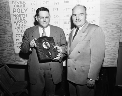 A. M. Pate Jr., left, membership roundup chairman for the West Side Branch YMCA, receives the new W. B. Todd annual award plaque for showing the highest number of new and renewed members in the drive from Paul S. Hayward, general secretary of the Fort Worth YMCA.